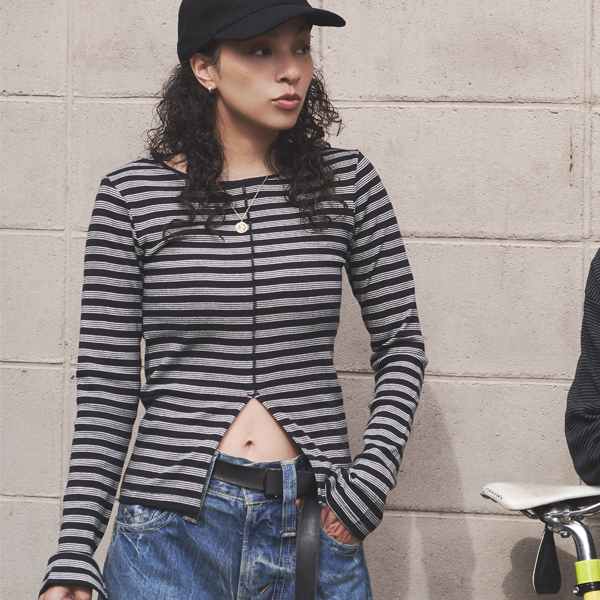 「Prib Slit PO」は、1枚ではもちろんレイヤードスタイルにもおすすめなL/S TEEです。フロントのスリットデザインはちらっと肌みせもでき、ボトムインで着用してもバランスをとりやすいデザインです。前後にはラインデザインが入っており、縦ラインのきれいなシルエットの印象を与えます。袖丈は長めの仕様なので、袖口にたまったシルエットもポイントです!
